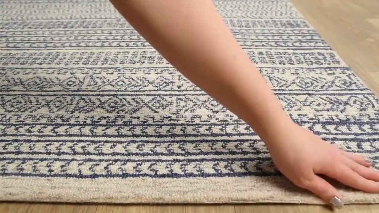 The Allport Tufted Maroc Wool Area Rug brings a fresh, globally-inspired look to any room with its crisp blue and white palette and richly layered Moroccan stripe pattern. Hand-tufted from 100% wool in India, this rug features row after row of intricate geometric and tribal motifs — each band slightly different, giving it a handcrafted, artisanal feel that's hard to find at this price point. The low pile (0.19 inches) keeps it sleek and easy to maintain underfoot, while the natural wool construction adds just enough cushion and warmth.