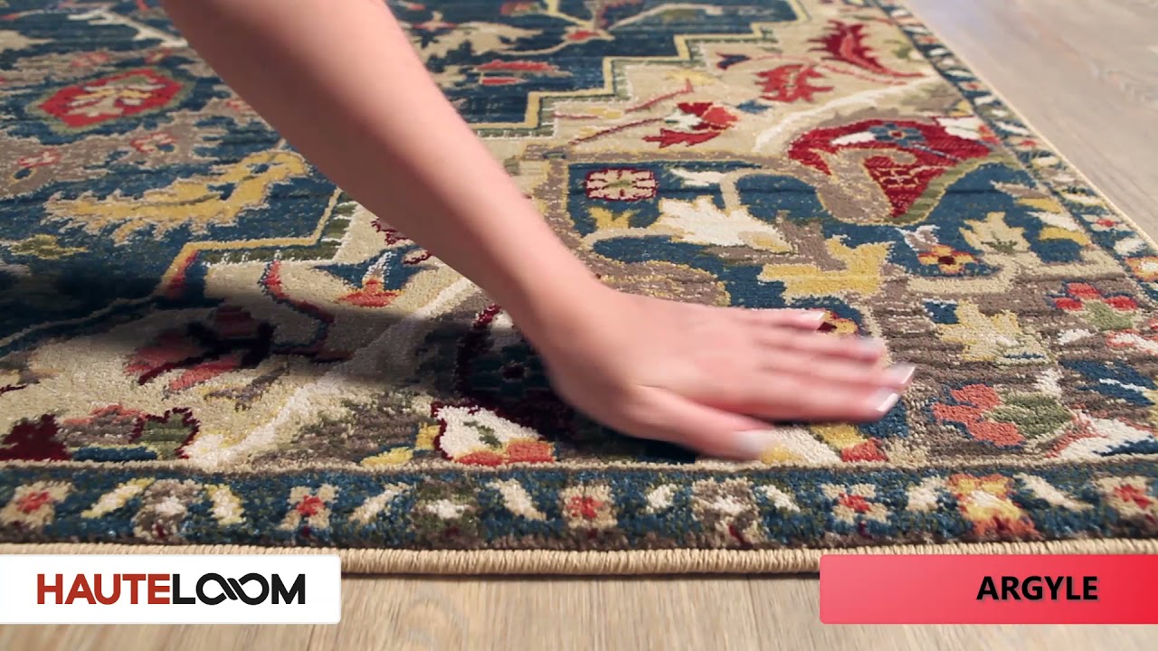The Argyle Area Rug brings the timeless beauty of Persian and Oriental design into your home with a striking steel-blue field, an ornate central medallion, and rich floral scrollwork in cream, red, burgundy, gold, and sage green. The intricate layered border frames the design with classic elegance, making it a true focal point in any room. Machine woven from 100% polypropylene in Turkey, this rug offers a medium pile (0.39 inches) that feels comfortable underfoot and holds up well in high-traffic areas.