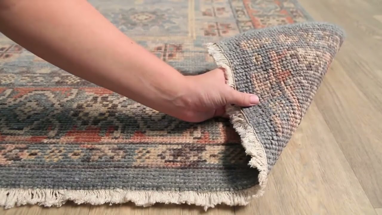 The Aripeka Area Rug is a stunning hand-knotted 100% wool rug that brings the timeless beauty of Persian design into your home. A soft blue-gray field anchors a richly detailed central medallion surrounded by intricate geometric and floral motifs in warm rust, orange, teal, and gold — a palette that feels both ancient and effortlessly current. The ornate multi-layered border frames the design with precision, while the low pile and tight hand-knotted construction give it a flat, refined texture that wears beautifully over time.