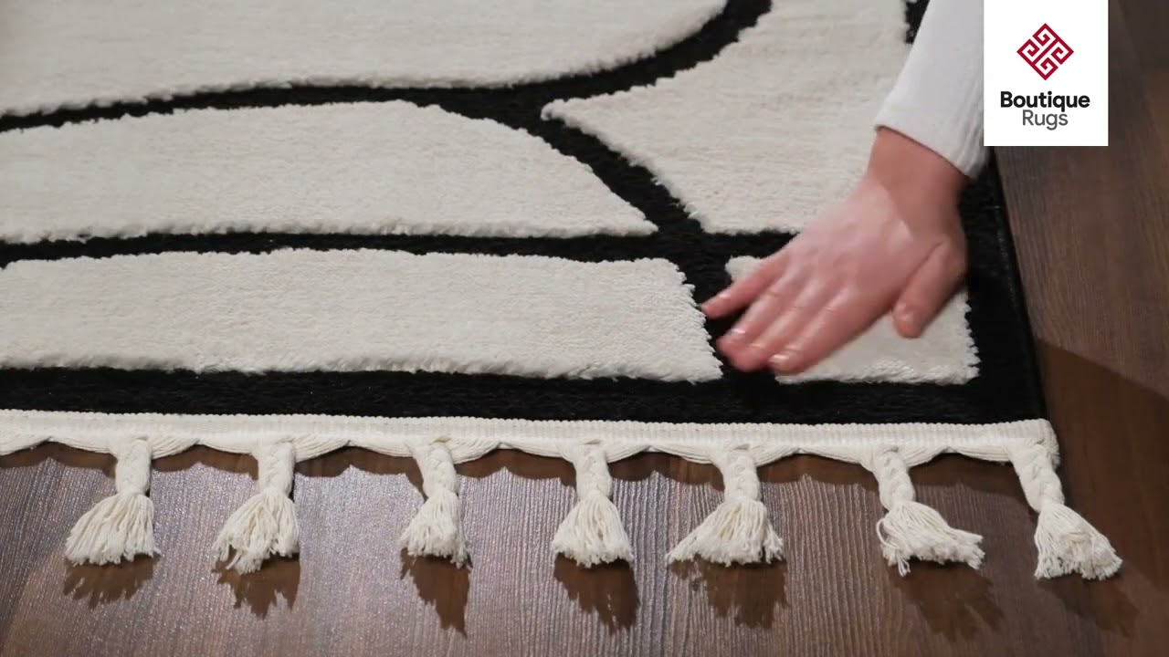 The cream and ivory base keeps the palette neutral and versatile, while the graphic black abstract pattern adds a modern, artistic edge to any room. Finished with delicate white tassels along the top and bottom edges, it brings a subtle boho touch to an otherwise clean contemporary look. Machine woven from 100% polypropylene with a jute backing, it's built to hold up in living rooms, bedrooms, and anywhere you want a soft, stylish anchor.