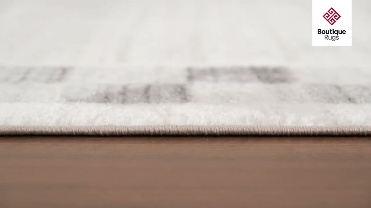 neutral paletteA warm cream dominates the open field, transitioning into a soft gray checkered border that frames the rug with quiet structure. The overall palette is cool-neutral and airy, with the gray tones adding just enough contrast to define the design without disrupting the calm.