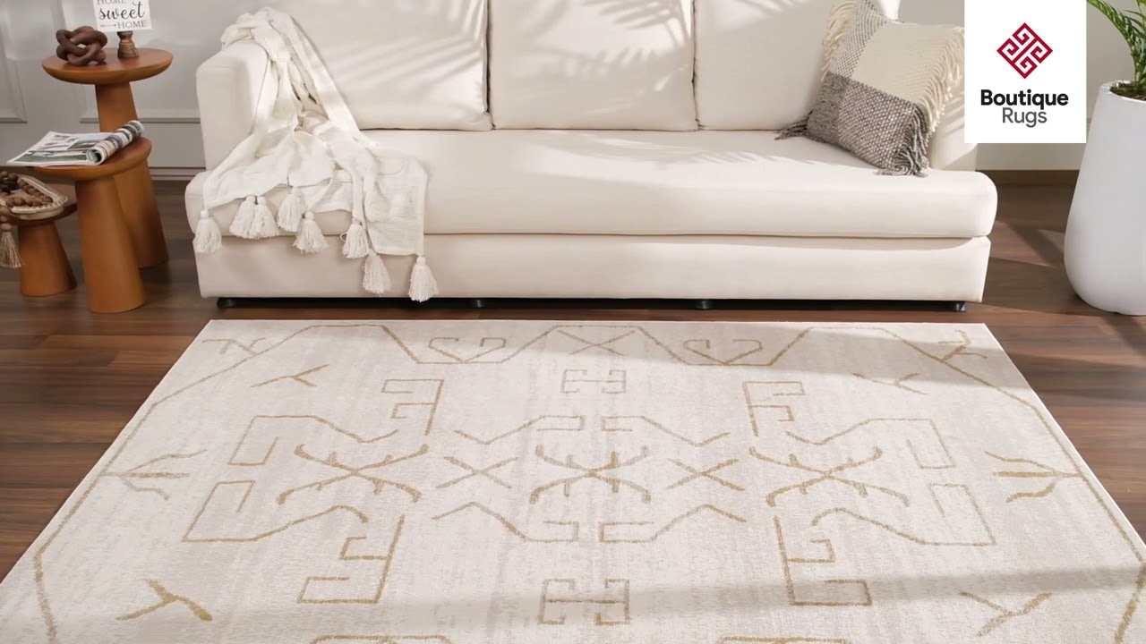 The Azzan Cream & Gold Area Rug brings a refined Moroccan tribal aesthetic to any space with its bold geometric motifs rendered in warm gold tones against a soft cream background. The symmetrical pattern features interlocking angular symbols, tribal-inspired line work, and a structured border that frames the design with quiet authority. Machine woven from 100% polypropylene, this rug is built for everyday life — durable enough for high-traffic areas while maintaining a clean, sophisticated look.