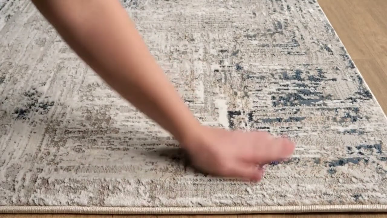 A soft beige and gray abstract distressed design with navy accents — the Balasing brings effortless modern depth to any living space.