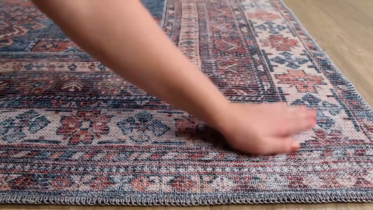 A stunning Persian medallion rug in rich blue and warm rust — fully machine washable, pet friendly, and soft enough to feel at home anywhere.