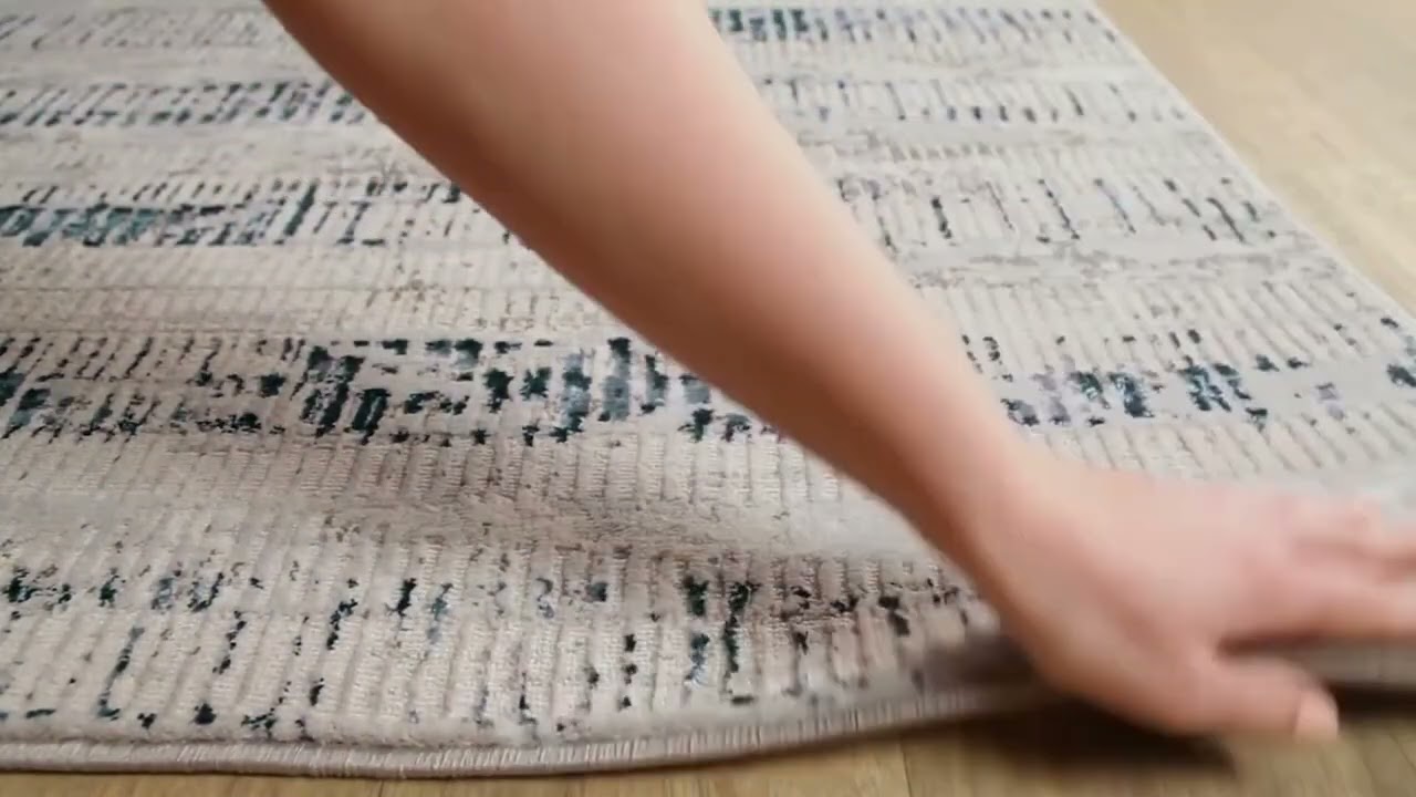 The Banana Area Rug brings a calm, modern energy to any room with its soft broken-stripe abstract pattern in cool shades of blue, gray, white, and cream. The horizontal dashes of navy and steel blue drift across a light gray and white ground, creating a quietly textured look that feels both contemporary and effortlessly livable. Machine woven in Turkey from a durable blend of polypropylene and polyester, this medium-pile rug is built to handle everyday foot traffic without sacrificing style.