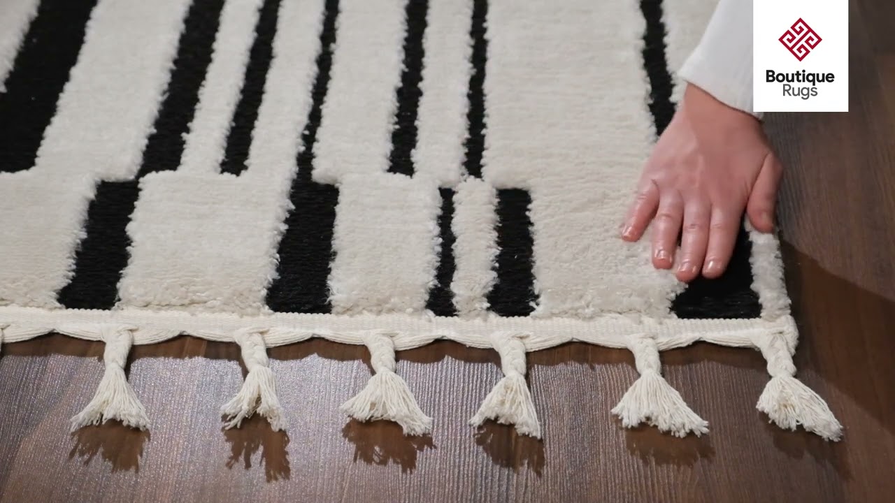 Graphic black-and-white broken stripes, plush 0.86" pile, and tassel fringe — the Bansi is a bold modern statement that works in any room.