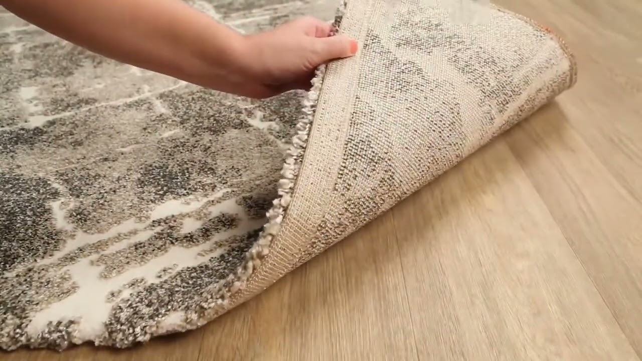 Warm beige and gray tones meet a painterly abstract pattern in this thick, plush high-pile rug — a versatile neutral that adds texture and depth to any modern space.