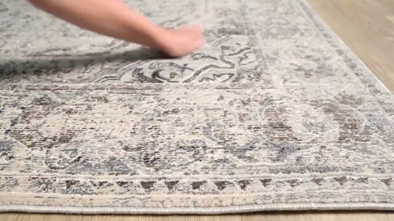 A softly faded gray and cream medallion rug with intricate traditional detailing — the kind of rug that looks like it took decades to find, but arrives at your door ready to impress.