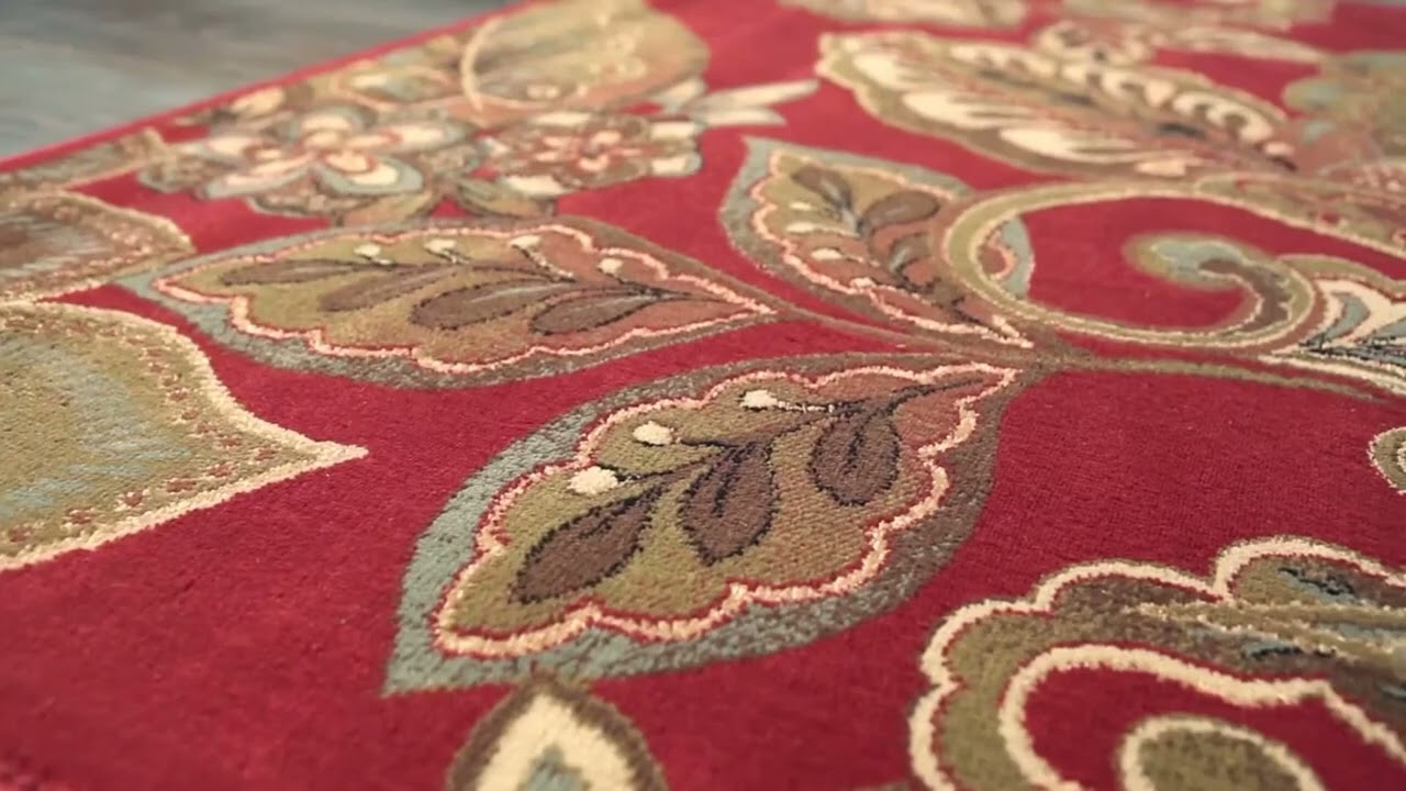 The Beedeville Area Rug makes an immediate statement with its rich crimson red background and sweeping traditional floral design. Large botanical motifs — oversized leaves, scrolling vines, and layered blooms — fill the surface in warm tones of brown, beige, cream, and soft teal, creating a lush, jewel-toned palette that feels both classic and vibrant. The style draws from Persian and Turkish design traditions, making it a natural fit for formal living rooms, dining rooms, or any space that calls for a touch of old-world elegance.