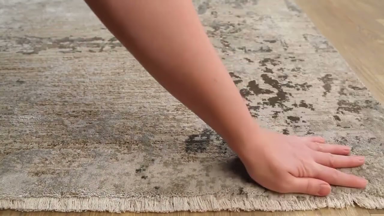 Soft grays and warm beige come together in a beautifully faded abstract pattern — the Bennet rug looks like a designer piece but lives like a durable everyday rug.
