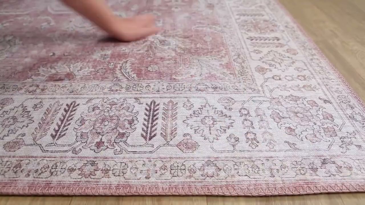 The Bergman Area Rug brings a soft, romantic charm to any room with its dusty blush-pink field and beautifully faded, distressed finish. At the center sits a classic Persian-style medallion surrounded by intricate floral scrollwork, all framed by a crisp gray and cream border — the kind of timeless design that feels both vintage and fresh. Machine woven from durable 100% polyester with a flat, low-profile construction, this rug is built to handle everyday life in high-traffic spaces without sacrificing style.