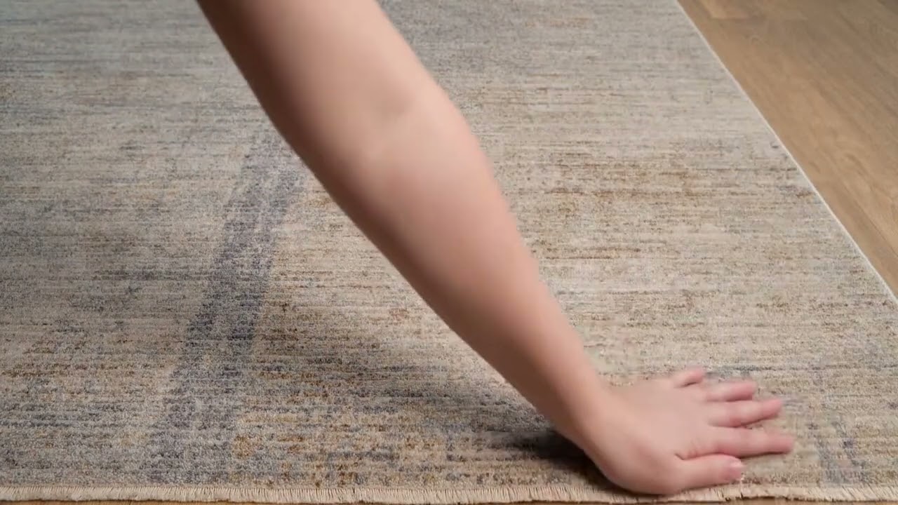 A softly distressed beige and gray abstract rug with fringe detail — neutral enough for any room, interesting enough to be the focal point.