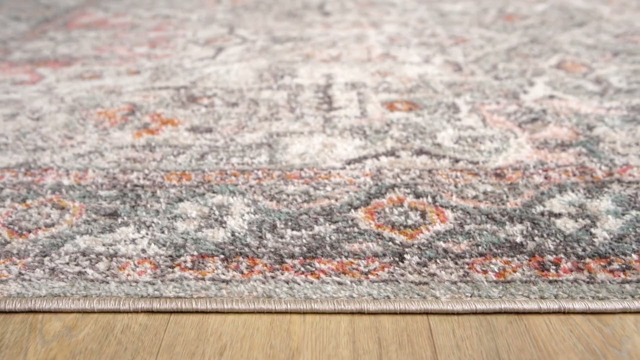neutral paletteA soft gray and cream base dominates the field, with warm rust and blush pink accents blooming through the medallion and corner motifs — the overall palette feels like a well-loved antique, neither too bold nor too muted.