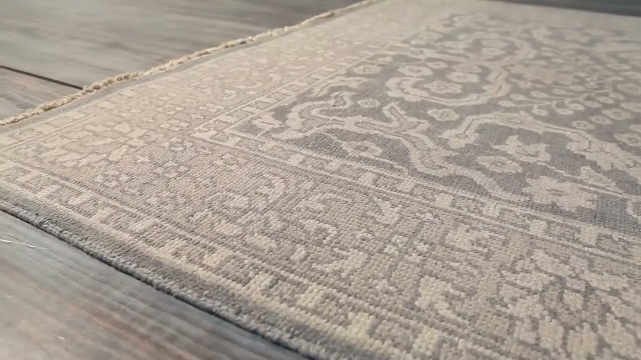 • Intricate Persian floral and vine allover pattern in gray and cream