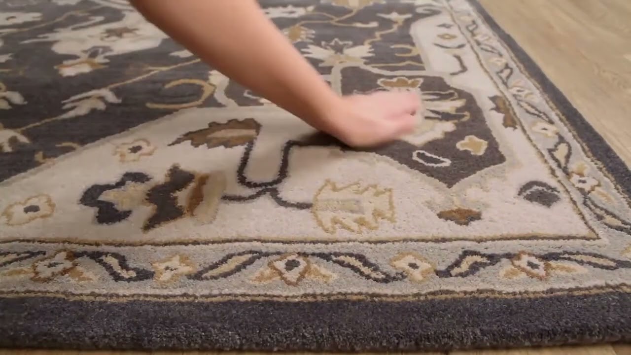 cool paletteA deep charcoal gray dominates the field, with cream and warm beige motifs forming the medallion and border details — the contrast is bold yet classic, giving the rug a timeless, sophisticated palette that reads as both dramatic and grounded.