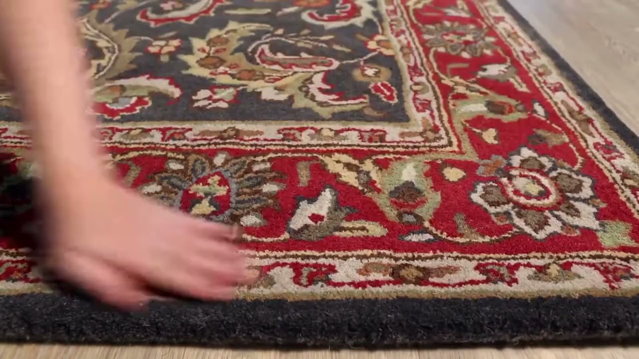 Rich charcoal and crimson Persian floral design, hand-tufted in 100% wool — thick, plush, and full of old-world character that anchors any room.