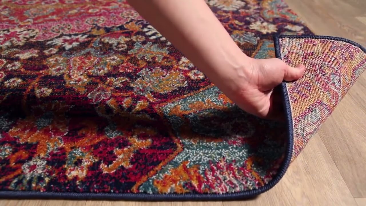 A jaw-dropping Persian medallion rug in fuchsia, burnt orange, and navy — vivid jewel tones that transform any room instantly. Stain-resistant polypropylene built for everyday life.