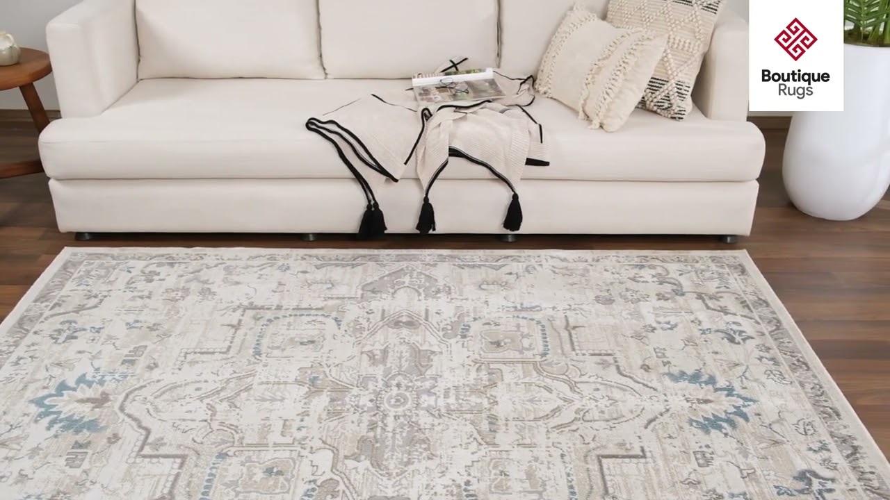 neutral paletteA warm cream base dominates the field, layered with soft gray medallion and border details and earthy taupe tones throughout — with small pops of muted blue that add just enough contrast to keep the palette from feeling flat.