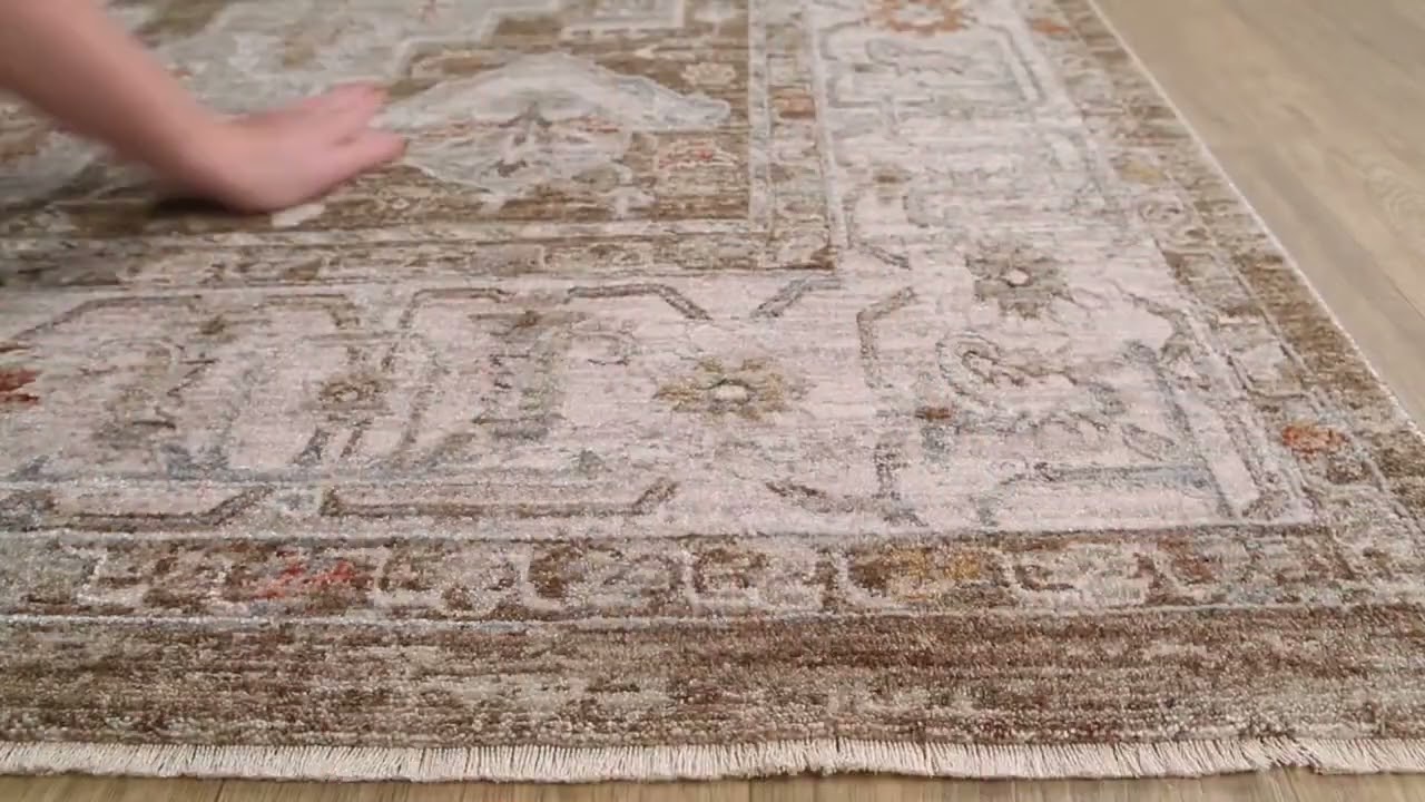 warm paletteA warm, earthy palette anchored by golden tan and olive-brown tones, softened by gray and cream in the field and border. Subtle rust and burnt orange accents appear in the floral motifs, giving the rug a rich, layered warmth without feeling heavy.