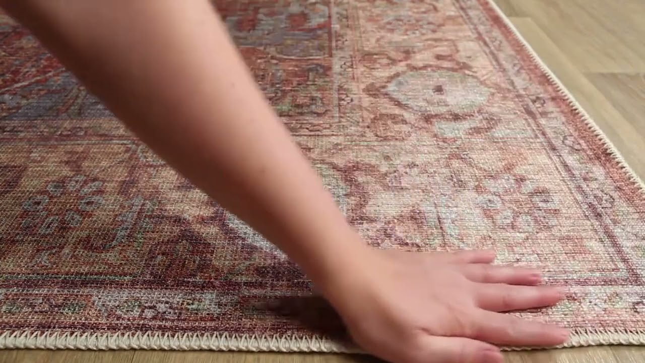 A fully washable Persian medallion rug in rich rust, beige, and dusty blue — traditional style that actually handles real life. Pet friendly and flatweave thin.