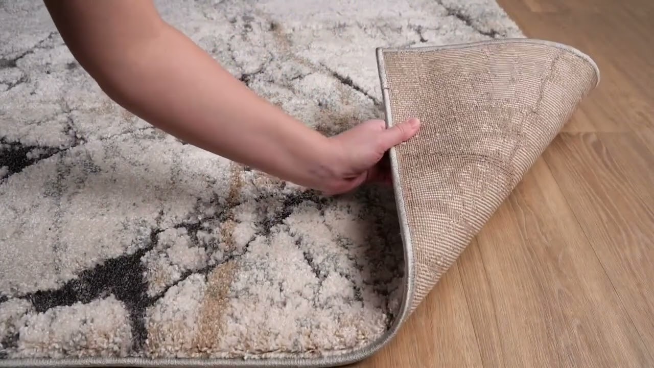 A luxuriously thick marble-inspired rug in soft gray and cream — the kind of plush, artistic statement piece that makes every room feel more intentional.