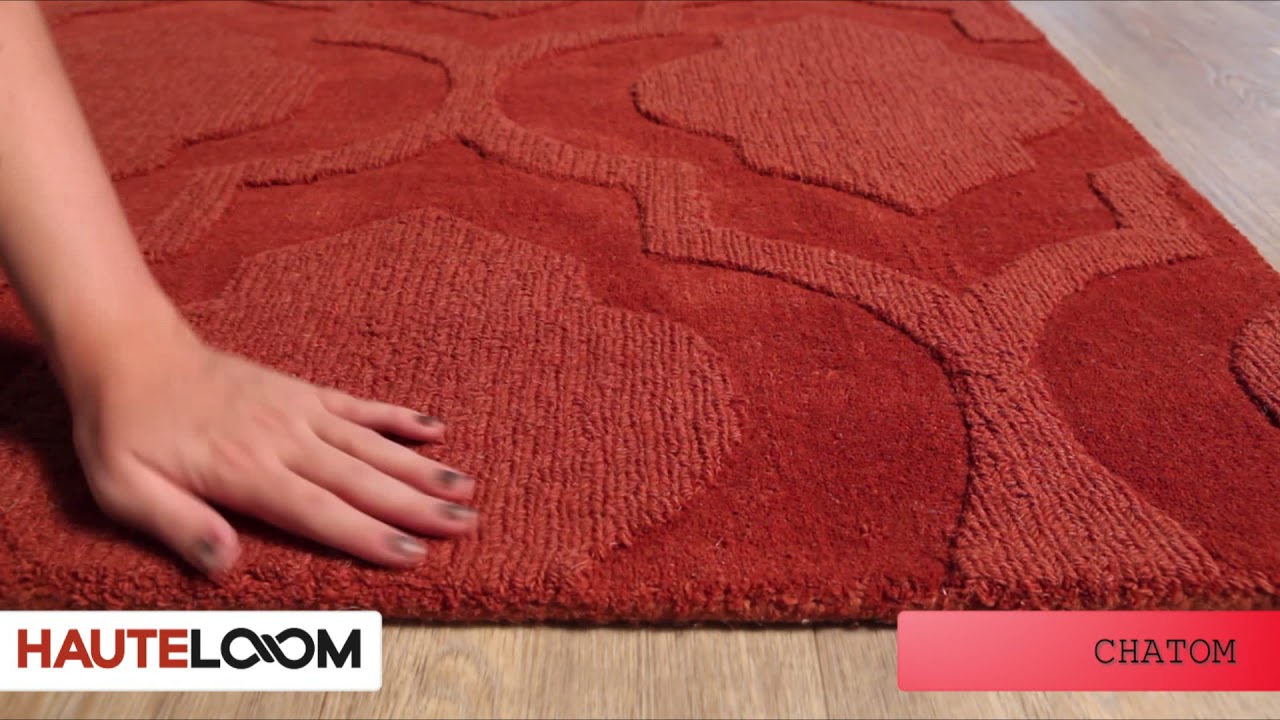 The Chatom Area Rug is a striking tone-on-tone statement piece in rich burnt orange and rust, featuring an allover Moroccan trellis pattern that feels both bold and refined. Hand loomed from 100% wool in India, this rug brings warmth and texture to any space with its medium pile and subtly embossed geometric lattice design. The tonal color play — where the pattern emerges through slight variations in the same orange-rust palette — gives it a sophisticated, almost sculptural quality that works beautifully in modern, contemporary, or transitional interiors.