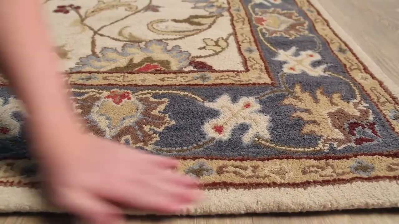 Intricate Persian floral scrollwork in warm beige and slate blue, hand tufted in 100% wool — this rug brings heirloom-quality style to any traditional or transitional space.