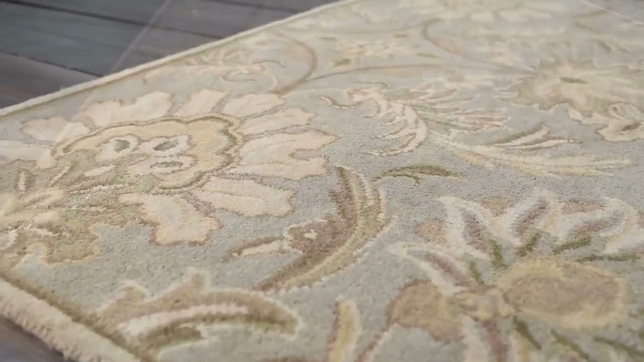 A beautifully detailed hand-tufted wool rug with classic floral medallion motifs in muted sage gray, warm beige, and cream — timeless style that anchors any room.