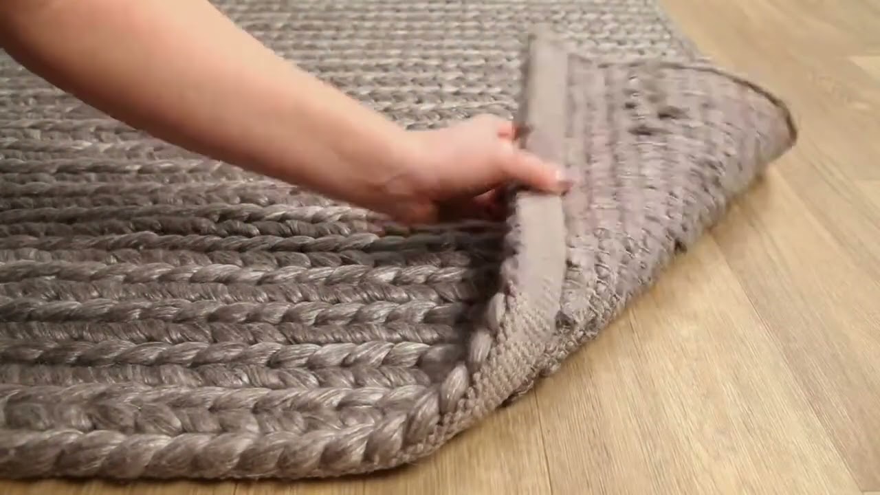 A hand-loomed wool and viscose blend with a richly textured loop weave in soft gray and cream — understated, durable, and endlessly versatile.