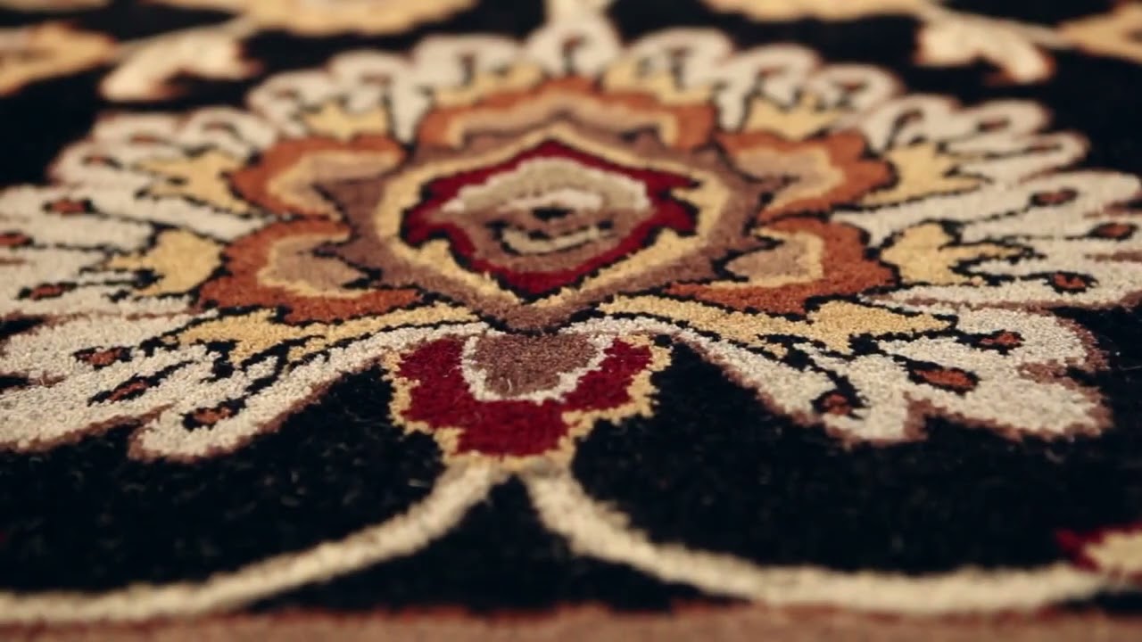 A dramatic black wool canvas covered in rich floral scrollwork — the Conesus brings classic Persian elegance and serious hand-tufted quality to any room.