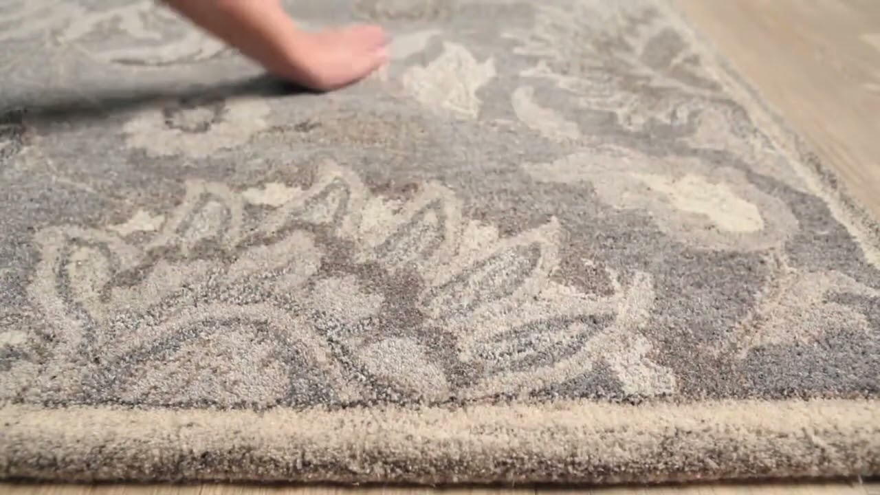 A beautifully detailed traditional floral rug hand tufted in 100% wool — soft, thick, and finished in a warm gray and taupe palette that works with almost anything.