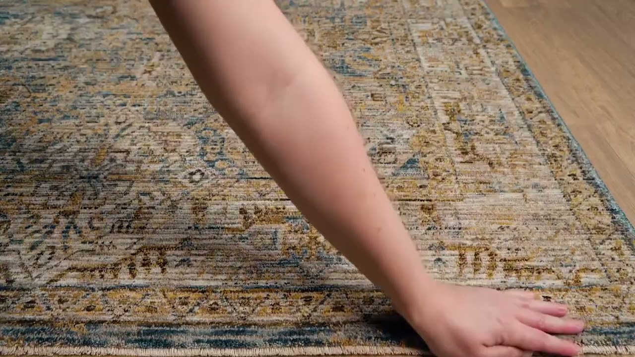 The Ange Area Rug brings the timeless beauty of a Persian-inspired design into your home with a beautifully distressed, faded finish that feels both antique and effortlessly current. A muted blue-gray base is layered with intricate floral and medallion motifs in warm beige, tan, mustard, and cream tones — the kind of color palette that works with almost any existing décor. The subtle worn-in look gives it that coveted vintage character without looking dated.