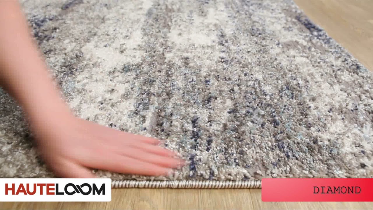 A thick, plush abstract rug in cool gray and navy blue — the kind of painterly, distressed design that makes a room feel curated without trying too hard.
