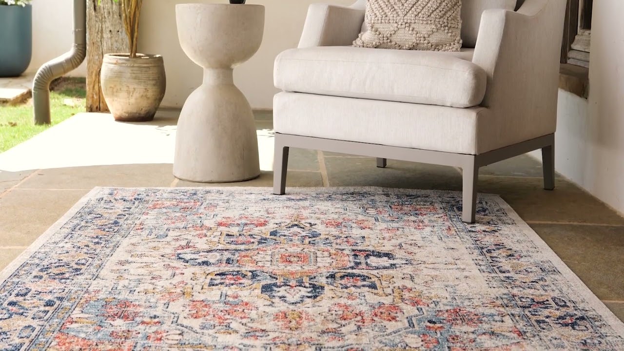 A classic Persian medallion in navy, cream, rust, and mustard — outdoor safe and stain resistant, so it looks stunning on your patio or in your living room.