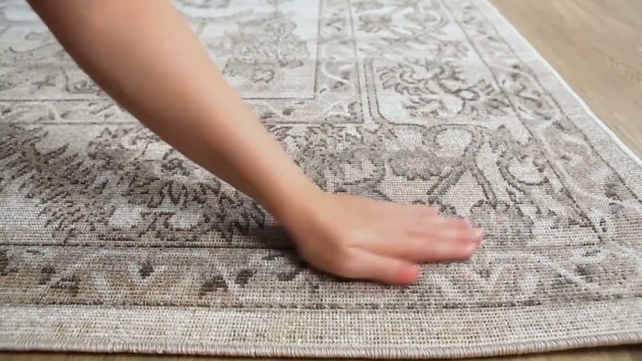A beautifully faded traditional floral rug in warm beige and gray — Persian-inspired scrollwork, durable polypropylene, and a low profile that's perfect under dining tables.