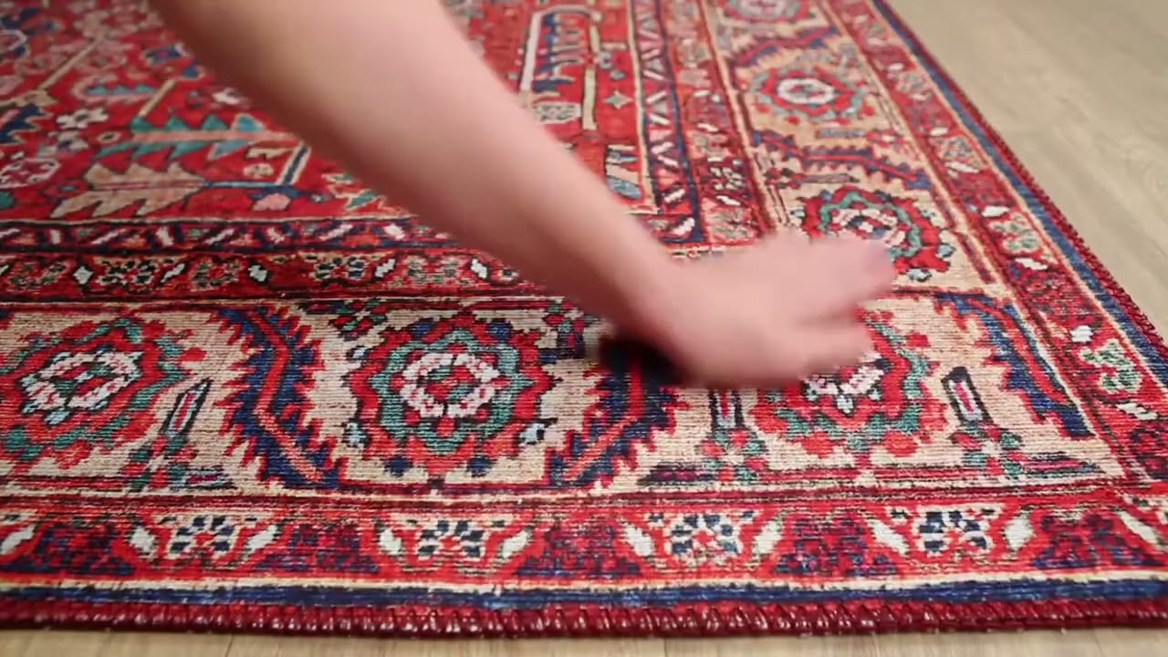 • Bold crimson red field with allover Persian floral pattern