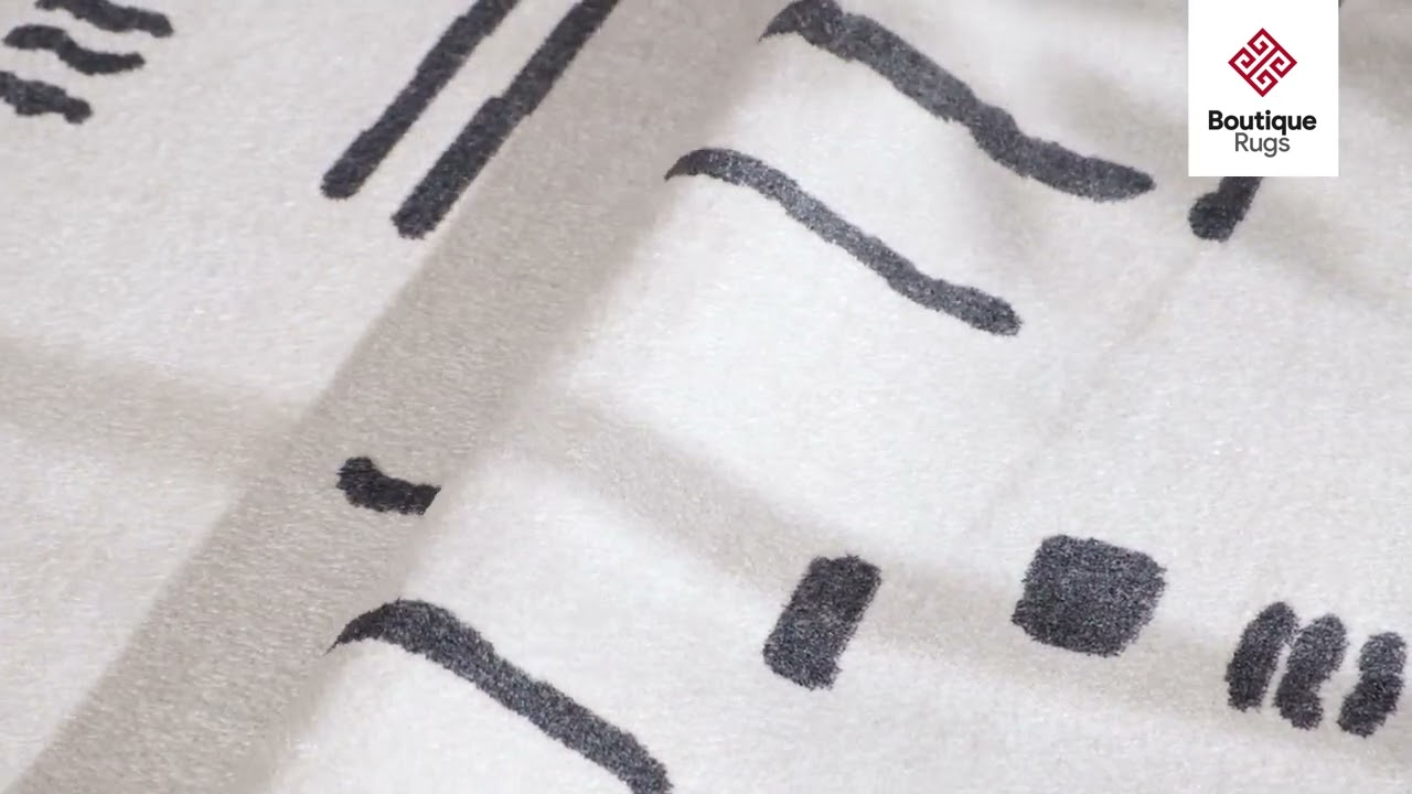 Bold abstract marks on a clean white ground — the Eitan is a machine-washable modern rug that looks like art and cleans like a dream.
