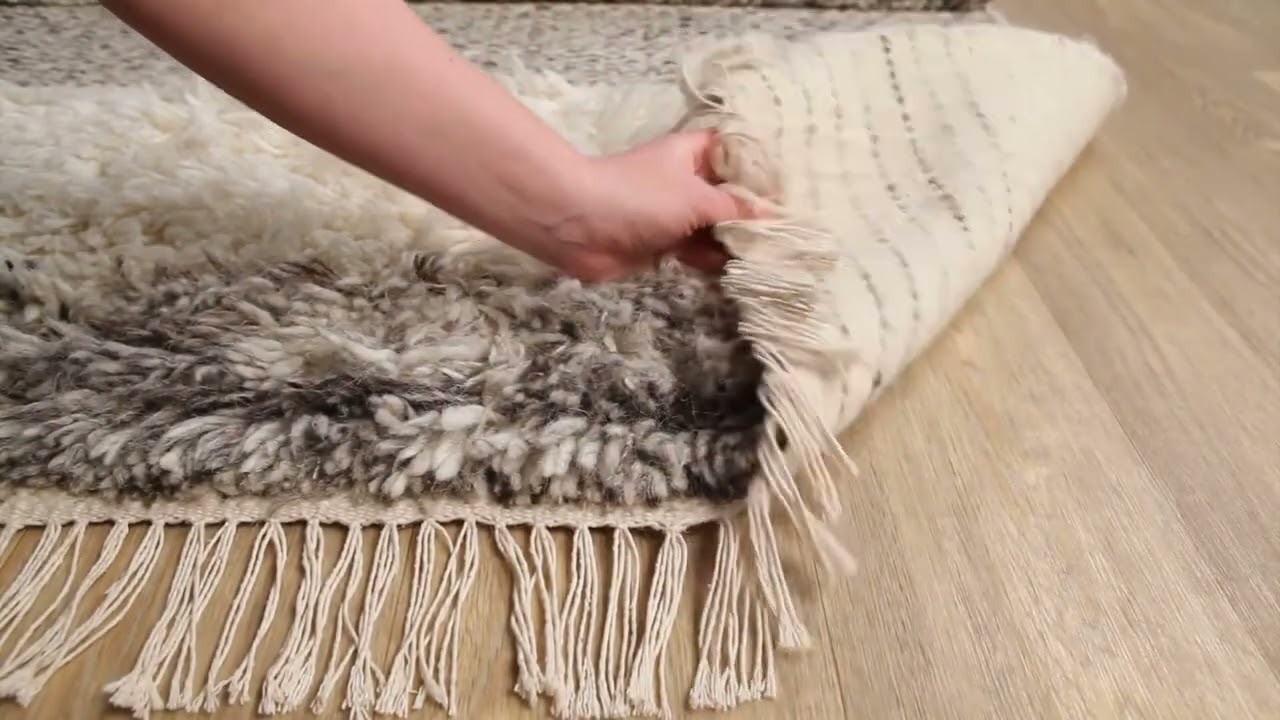Alternating plush shag and woven geometric bands in soft gray and cream — this handwoven NZ wool rug brings serious texture and boho warmth to any room.