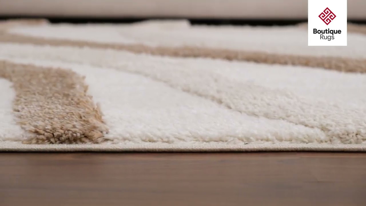 warm paletteA warm, enveloping cream dominates the surface, with sandy beige swirling lines carving through the pile to create a tone-on-tone effect that feels both subtle and visually dynamic — the overall palette is soft, neutral, and effortlessly calming.