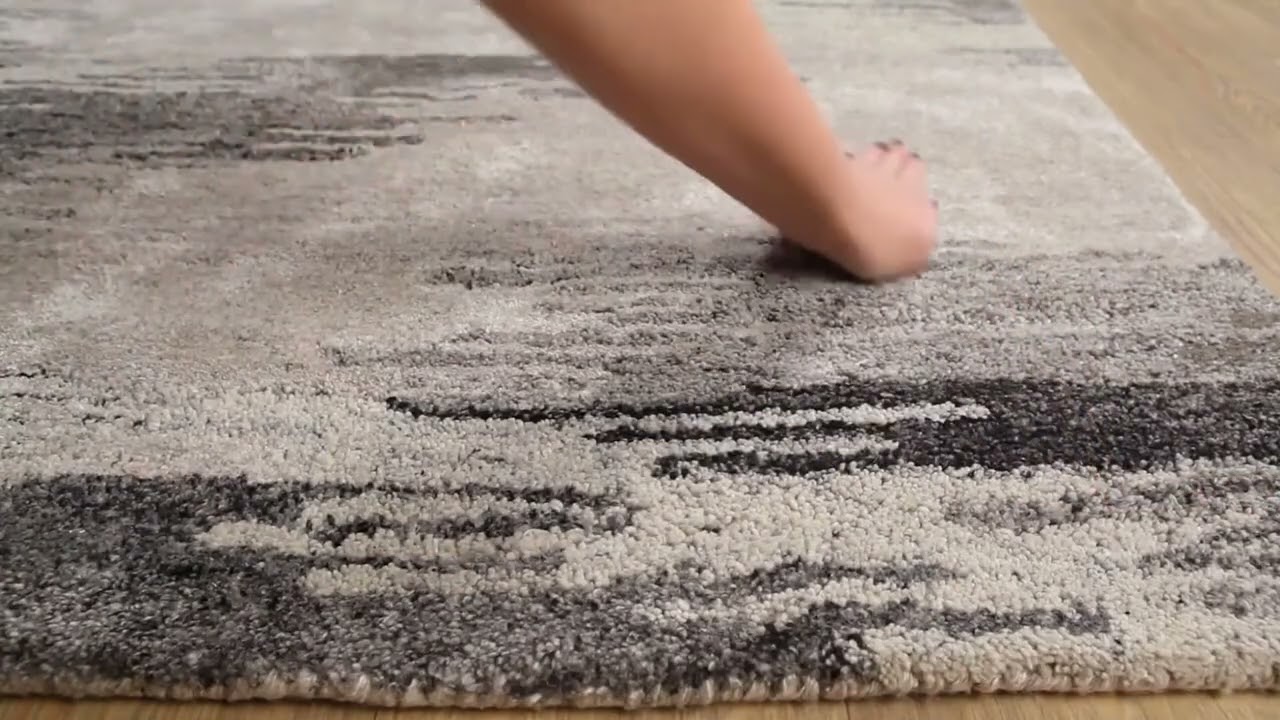 A painterly abstract ikat in charcoal gray and warm cream — this hand-tufted wool and viscose rug looks like art on your floor.