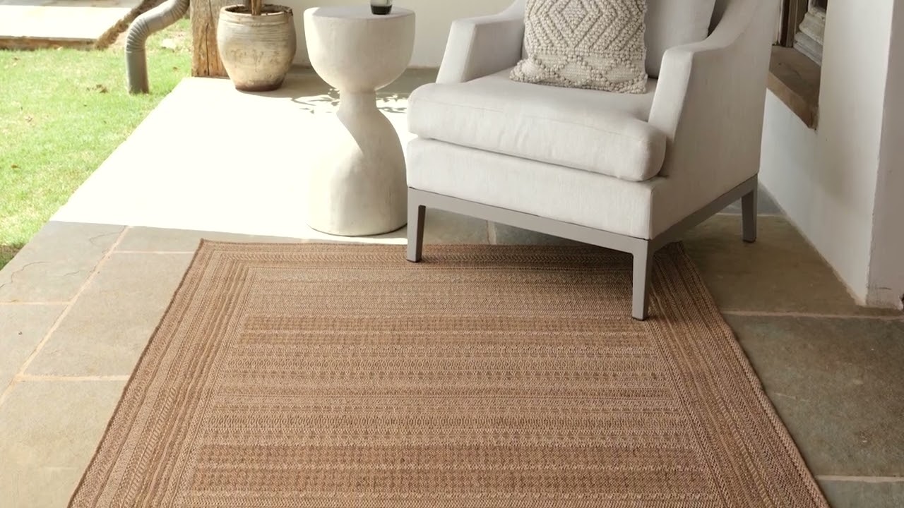 Warm tan stripes, a clean border, and zero-maintenance polypropylene construction — the Freja goes from patio to living room without missing a beat.