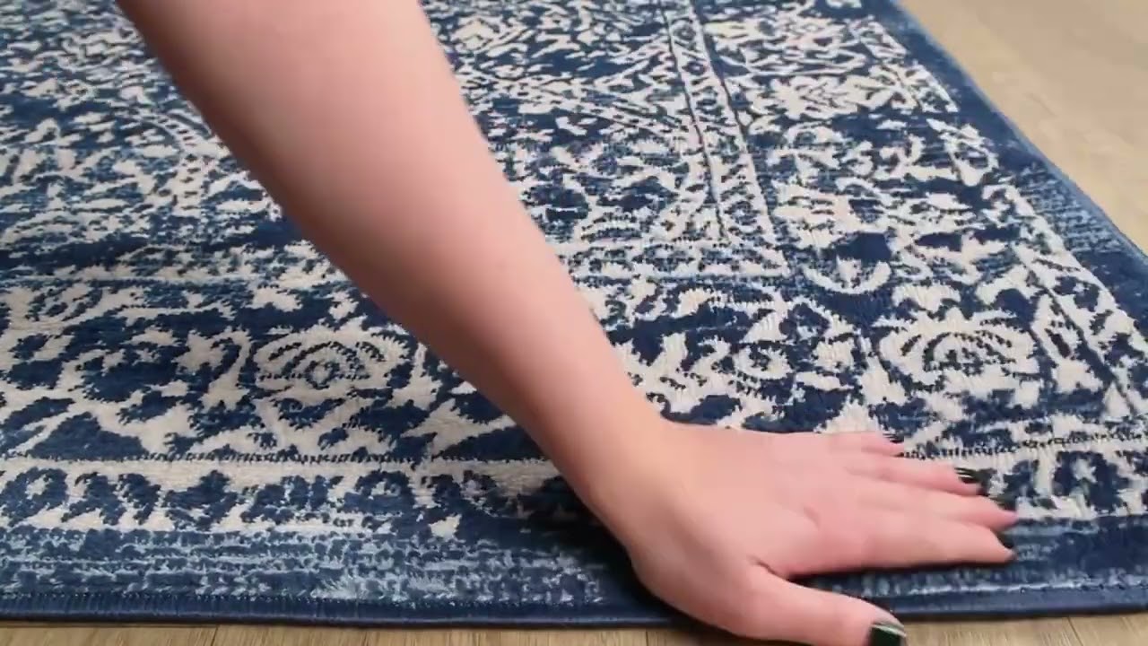 A richly patterned navy blue rug with faded ivory floral scrollwork — the look of a treasured antique, built tough in stain-resistant polypropylene.