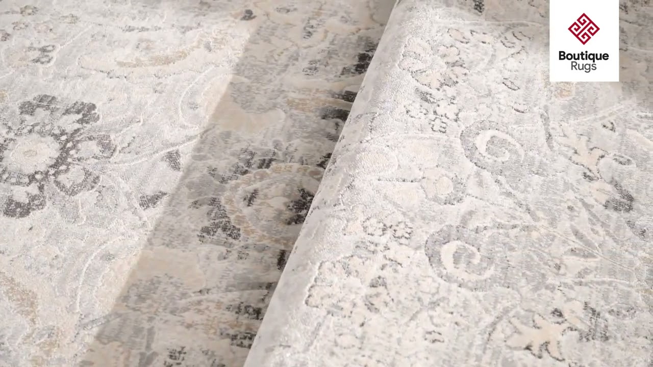 • Oushak-inspired faded floral pattern in warm beige and cool gray