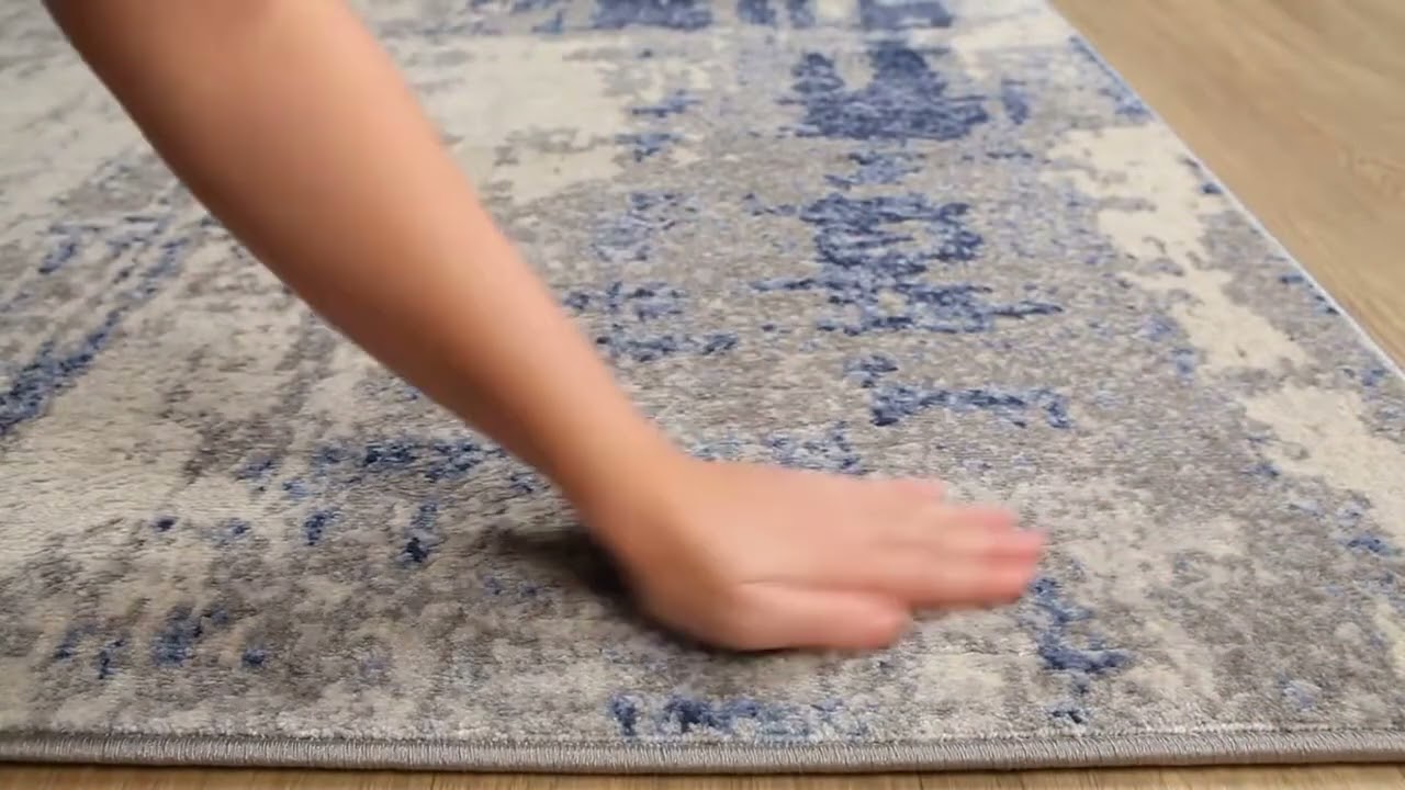 The Gerton Area Rug brings a sophisticated, gallery-worthy look to any room with its sweeping abstract design in rich navy and steel blue, soft cream, and layered gray tones. The pattern has a beautifully distressed, painterly quality — like an artist's canvas translated into a floor covering — making it feel both modern and timeless. Machine woven from 100% polypropylene in Turkey, this rug is built for real life: it's stain resistant, durable enough for high-traffic areas, and easy to spot clean.