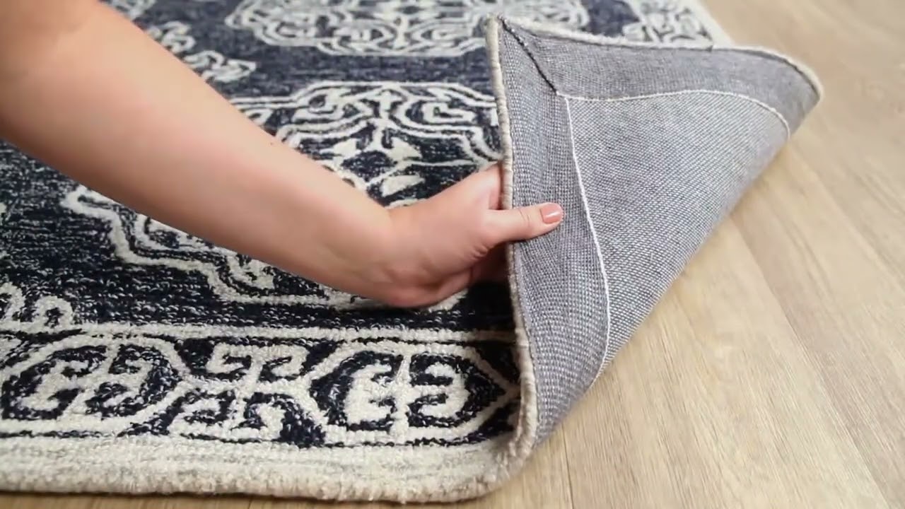 Bold navy blue meets crisp ivory in the Glenoma — a hand-tufted 100% wool rug with a stunning repeating medallion pattern that customers say looks even better in person.