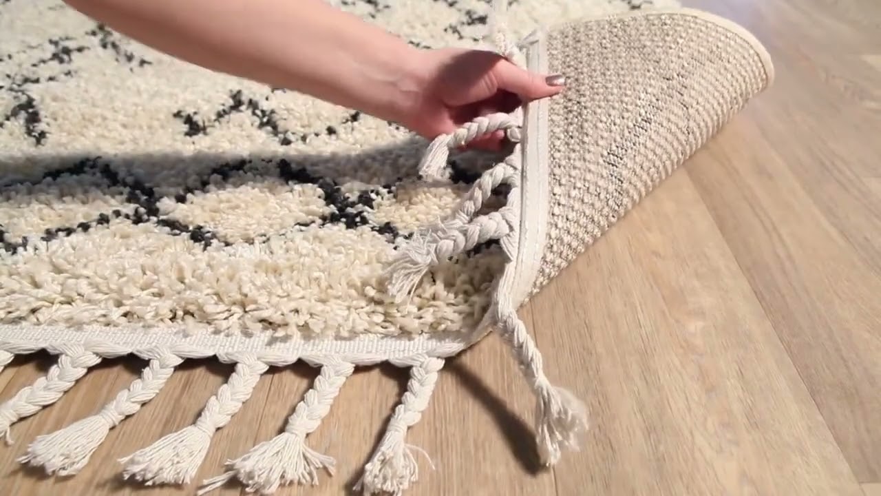 The Godalming Plush Area Rug brings effortless Moroccan-inspired style to any room with its classic Berber diamond lattice pattern in crisp cream and charcoal black. The plush 1.18-inch shag pile feels luxuriously soft underfoot, and the hand-knotted-look geometric motifs give it an authentic, globally-inspired character that works beautifully in living rooms, bedrooms, and beyond. Fringe tassels along the short edges add a bohemian finishing touch that elevates the whole look.