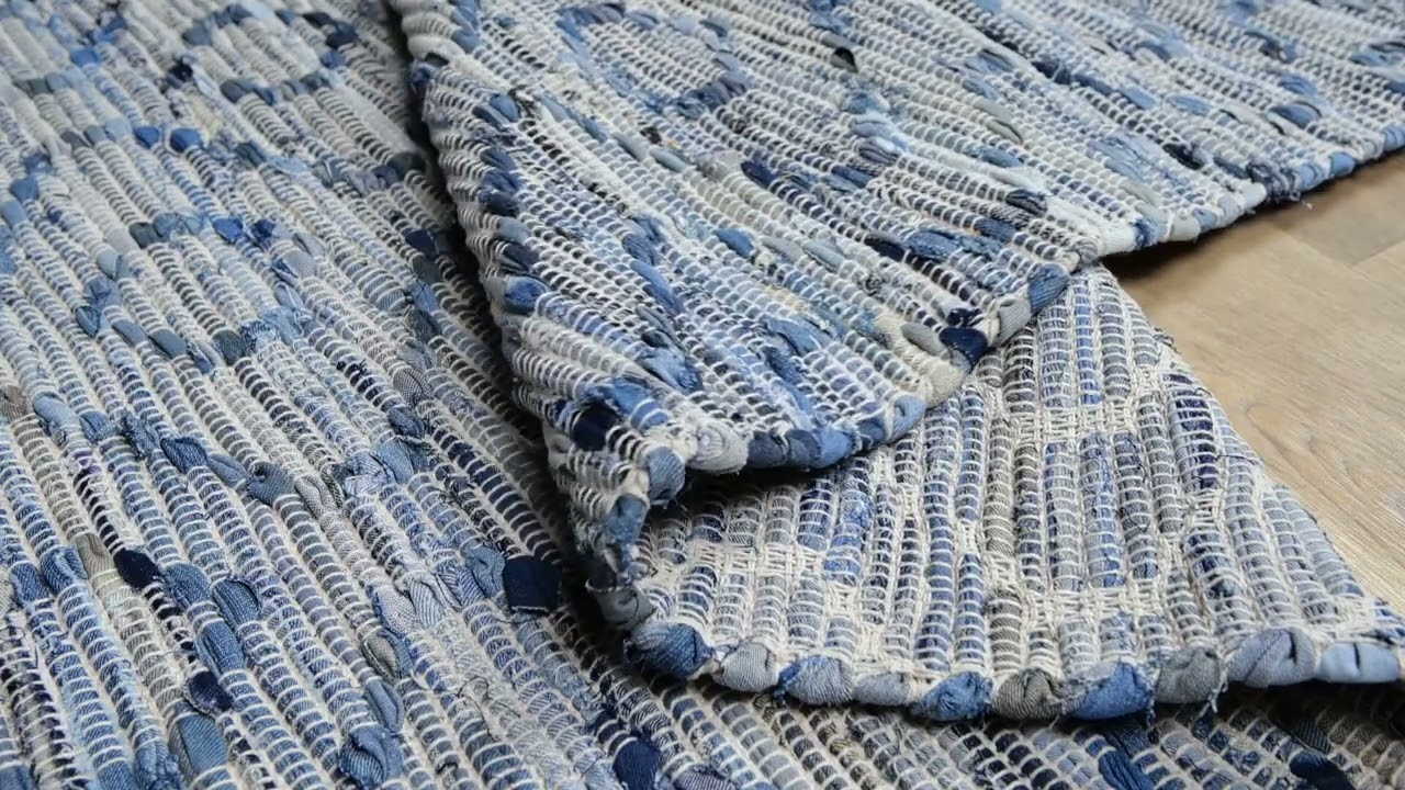 The hand-woven construction gives each piece a subtly organic quality, with slight variations in the weave that add character. Made in India from recycled materials, this rug is a genuinely sustainable pick that holds up well underfoot. The cool blue palette pairs beautifully with natural wood tones, white walls, and coastal or contemporary interiors.