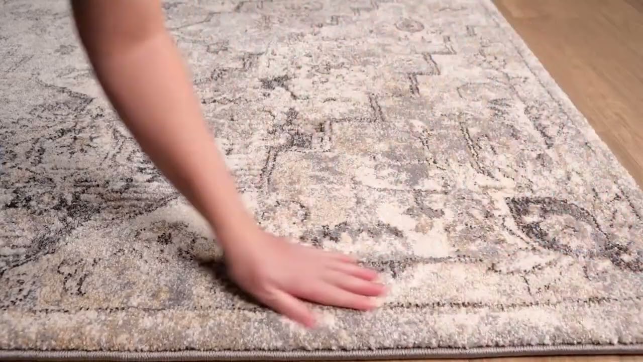 A plush, high-pile traditional medallion rug in soft grays and warm beige — the kind of classic Persian-inspired design that anchors any room with quiet sophistication.