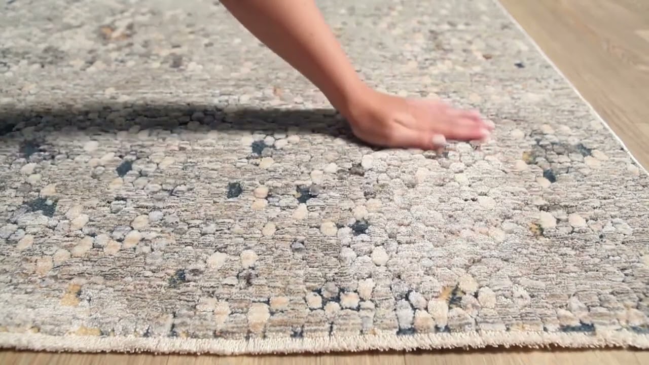 A soft gray mosaic rug scattered with blue, brown, and gold tones — understated enough to coordinate with anything, interesting enough to be the quiet star of the room.