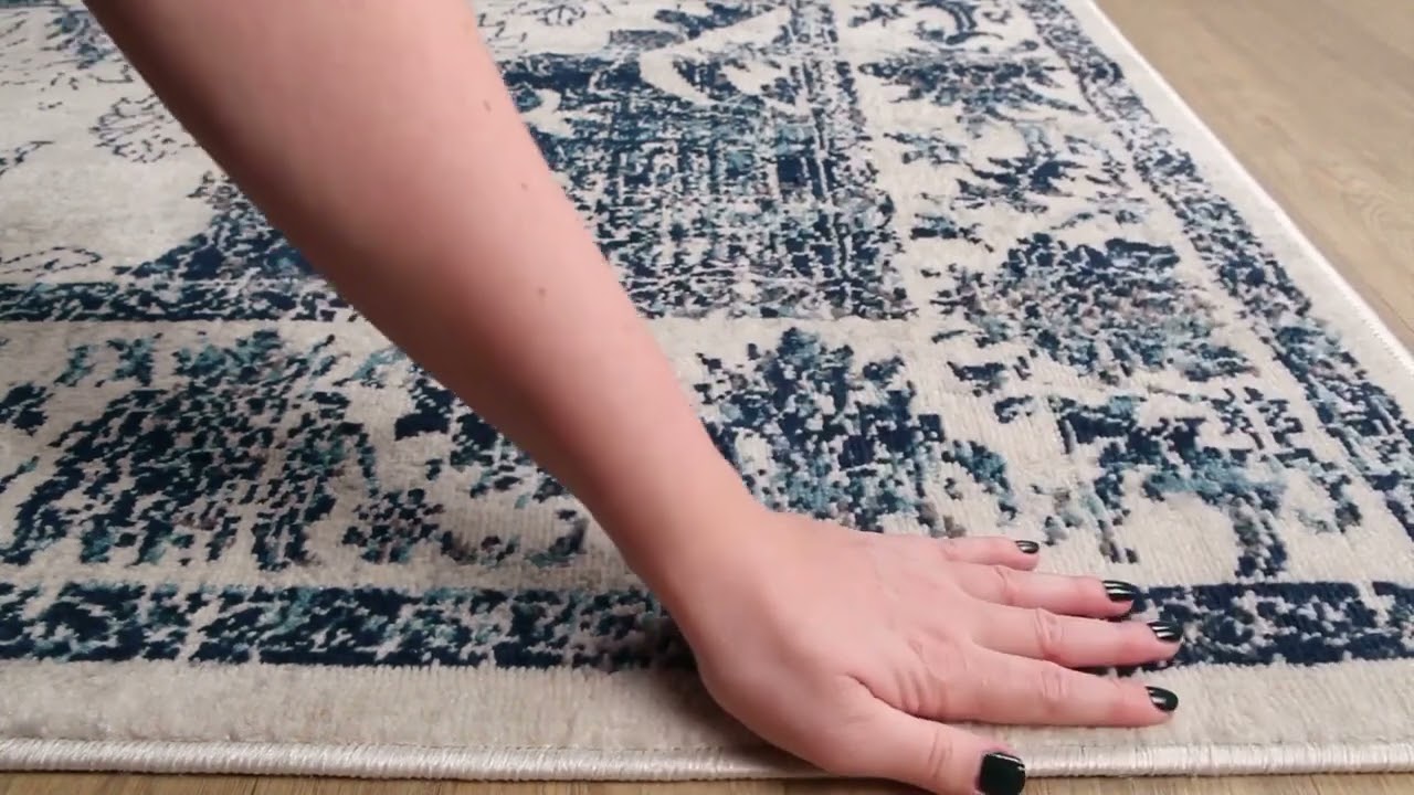 cool paletteA deep navy blue dominates the central medallion and border details, set against a soft ivory field — the intentionally faded, distressed finish blends the two tones into a cool, antique-feeling palette that feels both classic and effortlessly worn-in.